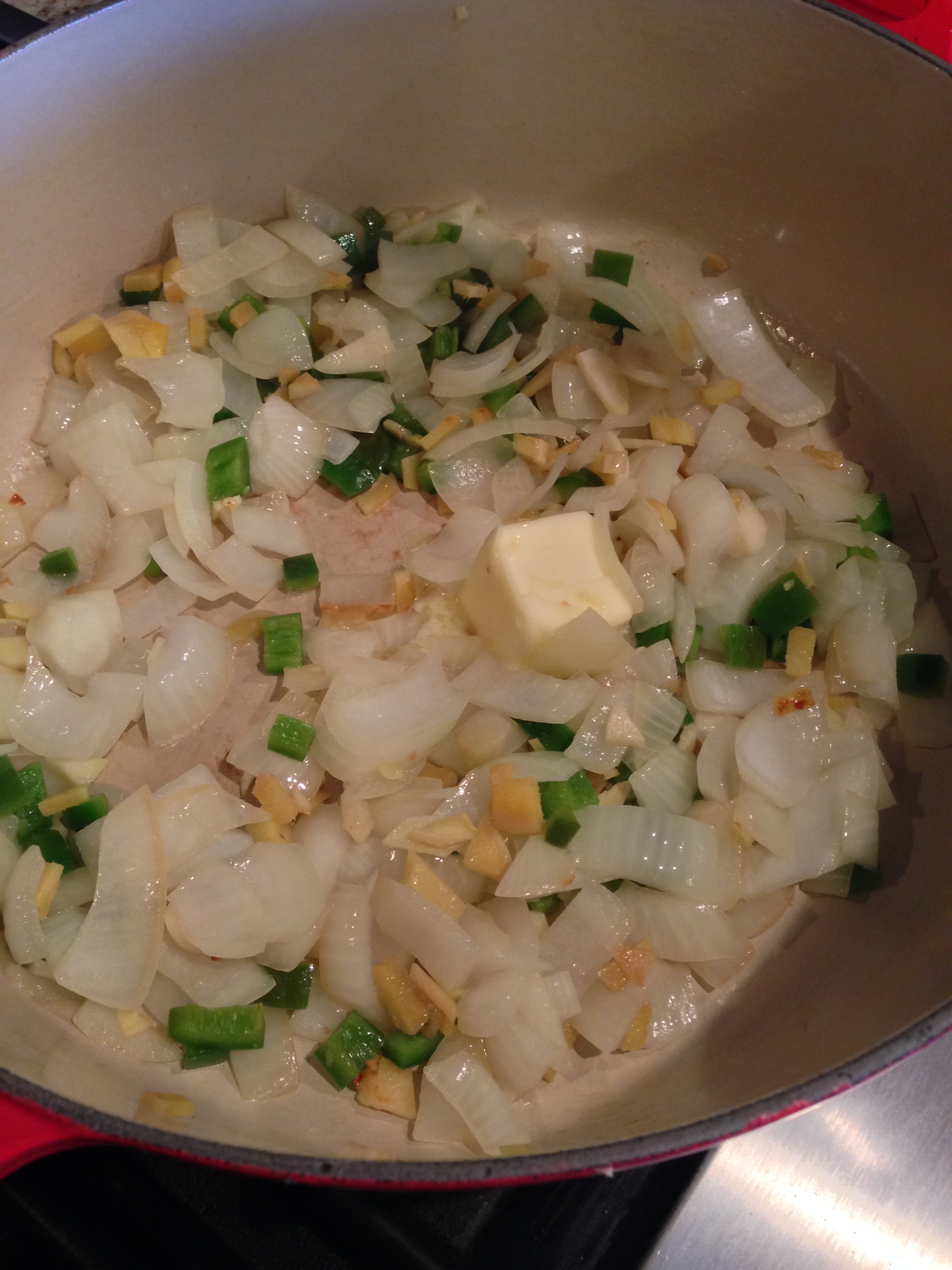 5. In a hot skillet over medium heat add some infused oil to coat the bottom of the skillet and saute the fresh minced garlic and ginger (make sure the pan is not too hot like mine was on the first round, it will instantly burn the garlic and ginger). You want a light brown with good fragrance before adding the sliced Hungarian peppers. Cook until the peppers get a little soft, about 5 minutes mixing constantly.