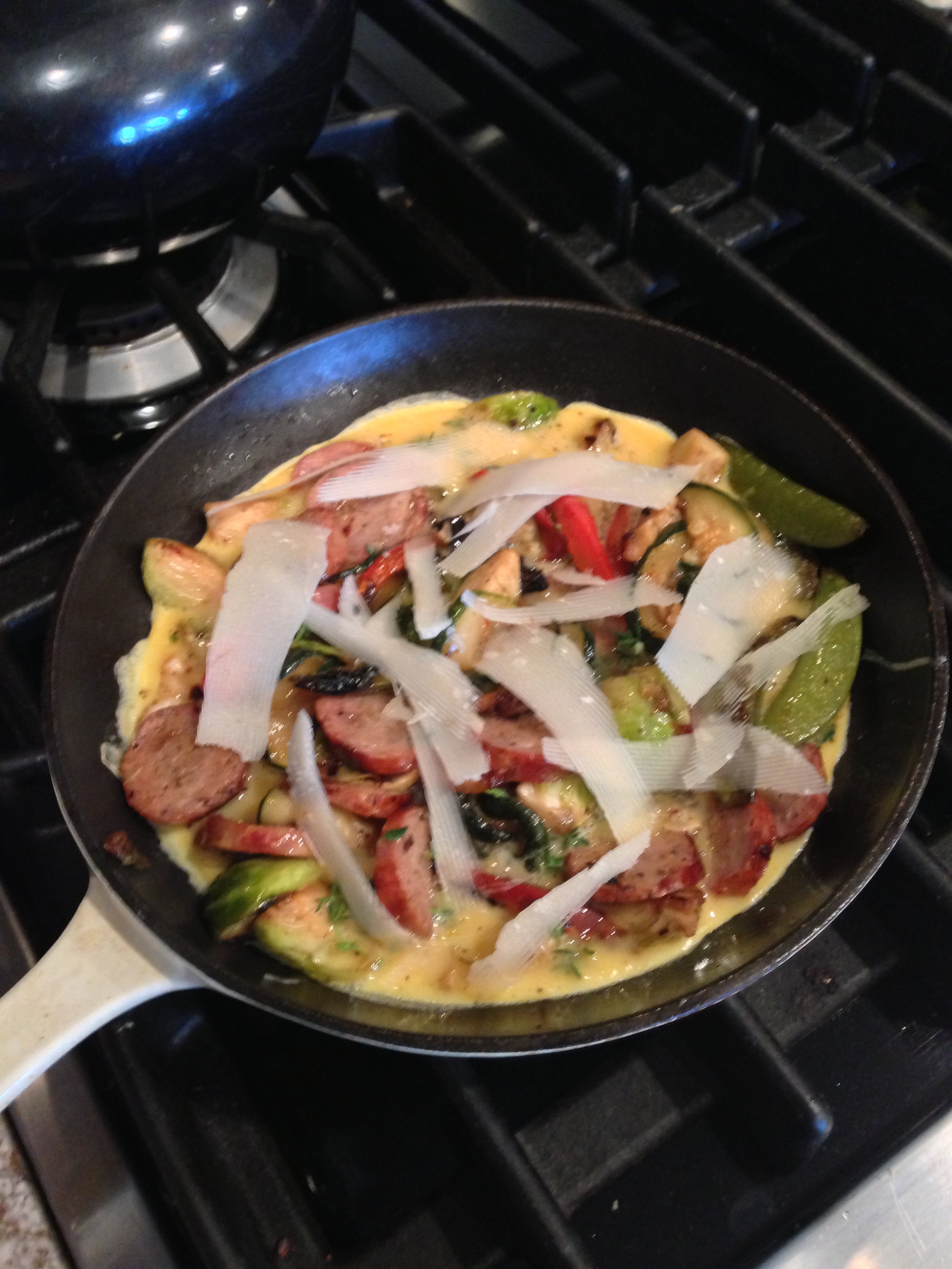 Leftovers do not have to be a repeat of the original meal. Making our leftovers into an entirely new dish is like a game for me. One of the best ways to use of leftovers is to make a frittata the next morning. The leftovers we have in tow this morning are truffle-oil brussel sprouts, spicy mixed grilled vegetables, and sausage.