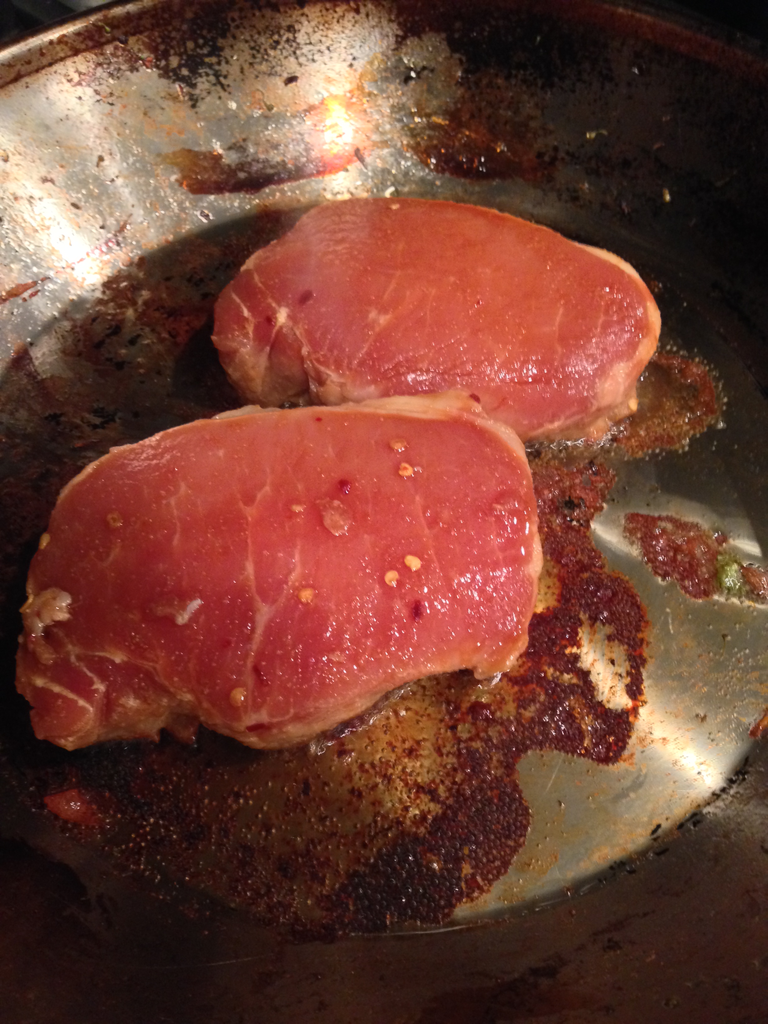 3. In a medium-hot skillet heat a generous amount of olive oil. Cook marinated pork chops ~4 minutes on each side until cooked through.
