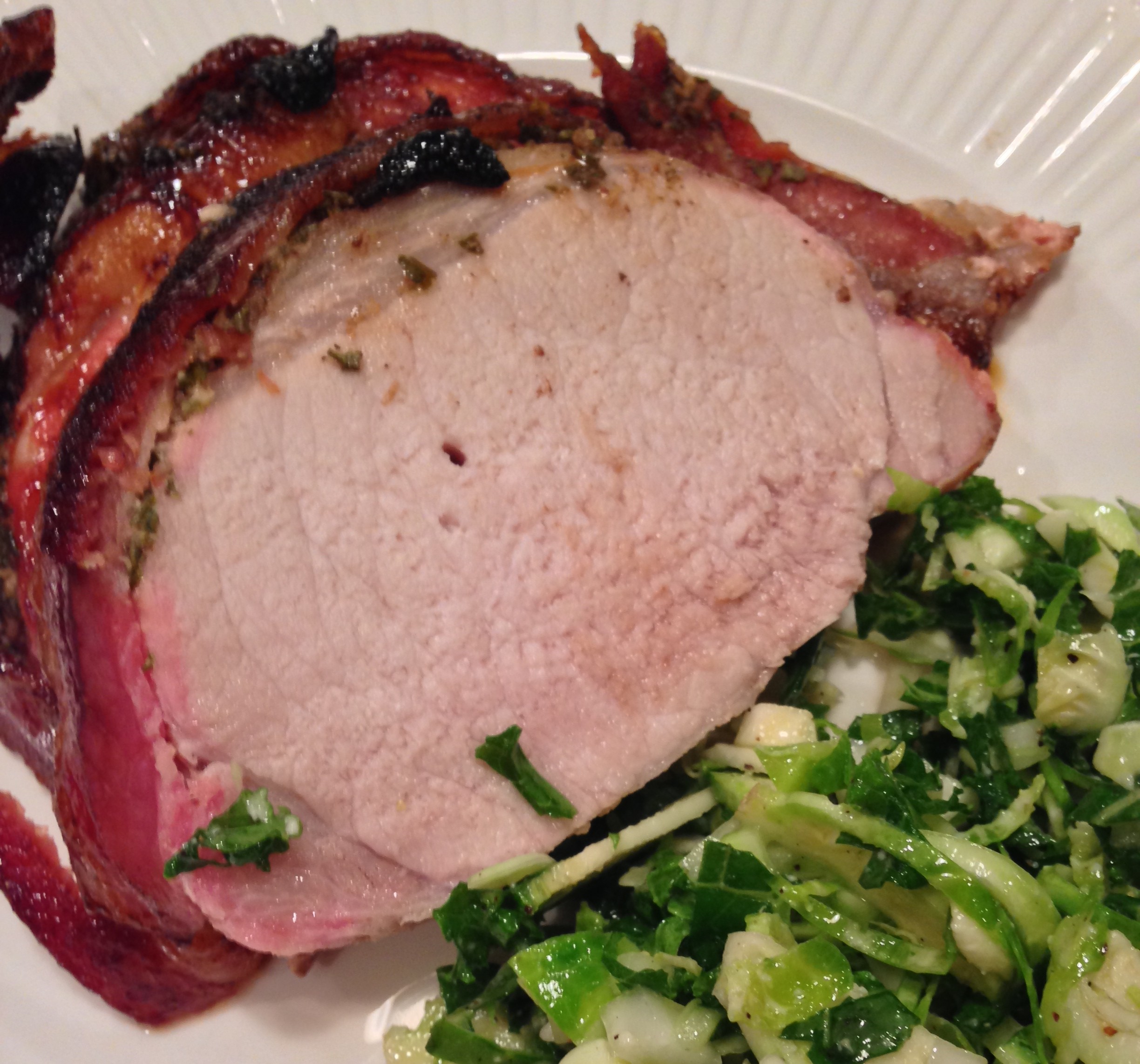 The glazed bacon was so fantastic and crispy with the flavorful layer of garlic herbs hiding underneath. I served this with a simple salad of shaved brussel sprouts, kale, and fennel tossed with a dressing made with fresh squeezed lemon, olive oil, and shaved parmesan topped with salt and fresh cracked pepper. So good with a nice flavor that didn’t get lost next to the bacon and pork.